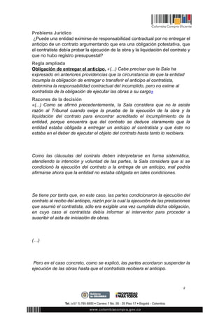Un municipio no puede eximirse de responsabilidad contractual por no entregar el anticipo de un contrato de obra pública argumentando que era una obligación potestativa. Según la sentencia, cuando el contrato condiciona la ejecución a la entrega del anticipo, la entidad está obligada a entregarlo. El contratista sólo puede suspender la ejecución si prueba que el incumplimiento de la entidad es grave o si las partes acordaron suspender la ejecución hasta recibir el anticipo.
