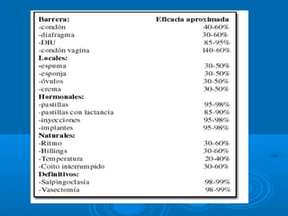 Este documento describe varios métodos anticonceptivos, incluyendo condones, diafragmas, dispositivos intrauterinos (DIU), condones vaginales, salpingoclasia y vasectomía. Explica brevemente cómo funciona cada método y algunos detalles clave sobre su uso y efectividad.