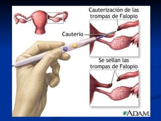 El documento proporciona información sobre diferentes métodos anticonceptivos, incluyendo su historia, efectividad y efectos secundarios. Describe métodos como la píldora, el anillo vaginal, el parche, la inyección, el implante subdérmico y el DIU, detallando cómo funcionan y sus ventajas y desventajas. También discute brevemente el uso de anticonceptivos a lo largo de la historia en culturas como Egipto, India, China y las culturas griega y romana.
