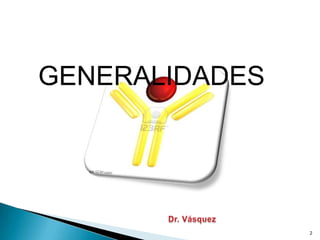 Las inmunoglobulinas son glicoproteínas producidas por los linfocitos B que pueden reconocer y unirse a sustancias extrañas al organismo llamadas antígenos. Están formadas por cuatro cadenas polipeptídicas, dos pesadas y dos ligeras, unidas entre sí. Cumplen funciones como facilitar la eliminación de antígenos, activar el sistema del complemento y mediar la respuesta inmune. Existen cinco clases principales de inmunoglobulinas.