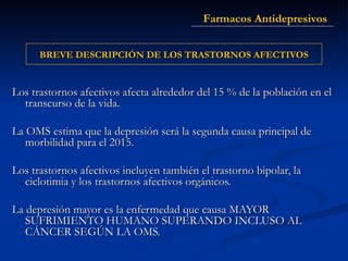 Este documento proporciona información sobre los trastornos afectivos y los antidepresivos. Describe las características de la depresión mayor y cómo puede ser secundaria a diversos trastornos orgánicos. Explica los mecanismos de acción y efectos de los antidepresivos cíclicos y los inhibidores de la MAO, así como sus efectos secundarios e intoxicación aguda.