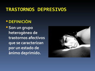Los trastornos depresivos se caracterizan por un estado de ánimo deprimido y síntomas como disminución del disfrute, apatía e insomnio. Los antidepresivos incrementan los niveles de serotonina y noradrenalina en el cerebro mediante la inhibición de la recaptación, lo que alivia los síntomas en semanas. Existen varios tipos de antidepresivos como los ISRS, IRSN y atípicos, que deben usarse con precaución por sus posibles efectos adversos y reacciones de sobredosis.