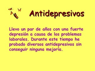 El documento habla sobre los problemas de depresión que ha tenido el autor durante varios años debido a problemas laborales. Ahora un nuevo antidepresivo le está ayudando mucho, ya que se siente más relajado y organizado en el trabajo, puede cumplir con sus obligaciones a tiempo y sus relaciones familiares se han normalizado.