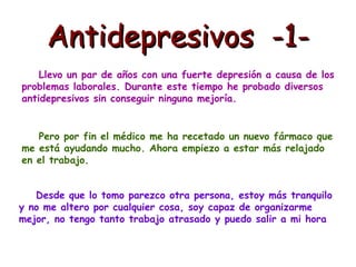 El paciente había estado sufriendo una fuerte depresión durante años debido a problemas laborales. Ningún antidepresivo anterior le había ayudado, pero un nuevo fármaco recetado por su médico está mejorando su estado de ánimo y funcionamiento, haciéndole sentir más relajado y organizado en el trabajo sin alterarse fácilmente. Incluso sus relaciones familiares han mejorado.