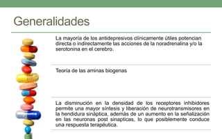 Este documento resume los principales tipos de antidepresivos, incluyendo inhibidores selectivos de la recaptación de serotonina, inhibidores de la recaptación de serotonina y noradrenalina, antidepresivos tricíclicos, inhibidores de la monoaminooxidasa y antidepresivos atípicos. Explica sus mecanismos de acción, usos terapéuticos comunes y efectos adversos. También cubre brevemente el uso del litio para tratar la manía y el trastorno bipolar.