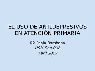 Este documento describe el uso de antidepresivos en atención primaria. Explica que los antidepresivos están indicados para el tratamiento de trastornos del estado de ánimo como la depresión mayor y la ansiedad, así como la impulsividad. Describe los principales tipos de antidepresivos, incluidos los inhibidores selectivos de la recaptación de serotonina y noradrenalina. Resalta la importancia del tratamiento individualizado y el ajuste de dosis para lograr los mejores resultados con los antidepresivos.