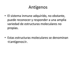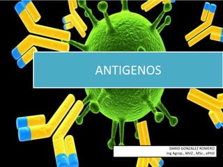 Este documento describe diferentes tipos de antígenos, incluyendo antígenos bacterianos, virales, de superficie celular y autoantígenos. Explica que los antígenos bacterianos incluyen componentes de la pared celular como peptidoglucano y lipopolisacáridos. También describe características de buenos antígenos como ser proteínas estables no propias y explica conceptos como epitopos y haptenos.