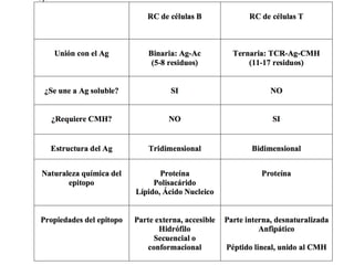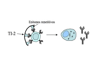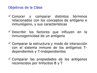Este documento define varios términos relacionados con antígenos e inmunogenicidad, como antígeno, inmunógeno, hapteno, tolerógeno y alérgeno. Explica que los antígenos pueden ser T-dependientes o T-independientes, y las diferencias en cómo estimulan a los linfocitos B. También describe factores que afectan la inmunogenicidad de un antígeno, como su tamaño, composición y accesibilidad, así como el uso de adyuvantes para mejorar la respuesta inmune