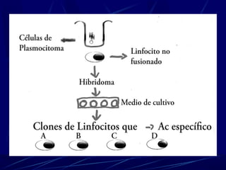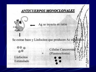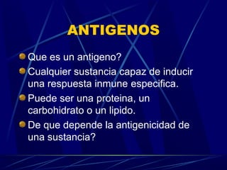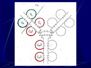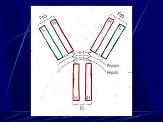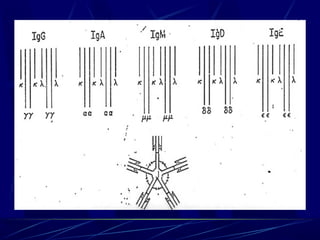 Este documento describe los antígenos y anticuerpos. Explica que los antígenos son sustancias que inducen una respuesta inmune y pueden ser proteínas, carbohidratos o lípidos. Describe las cinco clases principales de anticuerpos (IgG, IgM, IgA, IgE e IgD) y sus características. También resume varias pruebas de laboratorio utilizadas para detectar antígenos y anticuerpos.