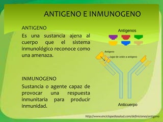El documento detalla conceptos fundamentales sobre antígenos e inmunógenos, definiendo antígenos como sustancias ajenas que generan respuestas del sistema inmunológico. Se clasifican en xenoantígenos, aloantígenos y autoantígenos, y se diferencian entre antígenos timo-dependientes e independientes. Además, menciona la generación de anticuerpos por linfocitos B y explora experimentos históricos en inmunología.