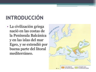 Este documento presenta una introducción general a la antigua civilización griega. Resume que los griegos se organizaron en ciudades-estado independientes llamadas polis unidas por lazos culturales. Explica que en Atenas se estableció la democracia en el siglo V a.C. y que Alejandro Magno expandió la cultura griega a través de un gran imperio. Finalmente, señala que los griegos destacaron en filosofía, ciencia, arte, deportes y formas de gobierno.