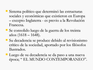 El documento describe el Antiguo Régimen, un sistema político y social que dominó Europa antes de la Revolución Francesa. Se caracterizó por la monarquía absoluta, donde los reyes gobernaban con poder divino y control total. En Francia, Luis XIV personificó este absolutismo real a través de la construcción de Versalles y la revocación del Edicto de Nantes. La decadencia del Antiguo Régimen se debió a las críticas de los filósofos de la Ilustración y a las guerras religiosas como la Guerra de