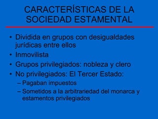 La sociedad del Antiguo Régimen en Francia estaba dividida en estamentos con desigualdades legales. El primer estamento era la nobleza, que tenía privilegios como exención de impuestos y ocupaba la mayoría de cargos políticos. El segundo estamento era el clero, con propiedades e influencia política y cultural. El tercer estamento, el más numeroso, incluía a campesinos, burgueses y artesanos que pagaban impuestos y estaban sometidos a la autoridad del rey y los estamentos privilegiados. Dentro de cada