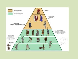 El documento describe la estructura social, económica y política del Antiguo Régimen en el siglo XVIII en Europa, con un enfoque en España. La sociedad era estamental, dominada por la nobleza y el clero. La economía era principalmente agrícola y rural, con baja productividad. Políticamente, había una concentración del poder en la monarquía absoluta. La Ilustración cuestionó este sistema y propuso ideas como la soberanía popular y los derechos naturales. En España, los Borbones intentaron reformas como el Despotismo