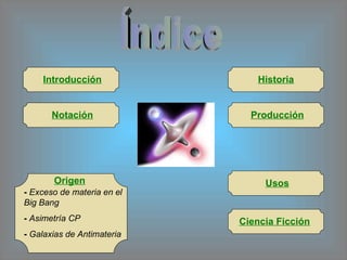 Este documento resume la antimateria, incluyendo su origen, propiedades, producción y usos. Brevemente describe que la antimateria está compuesta de antipartículas como el positrón y el antiprotón, y que aunque se cree que originalmente existía en igual proporción que la materia en el Big Bang, ahora existe muy poca en el universo.