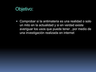La antimateria existe cuando las partículas tienen cargas opuestas a la materia normal. Se cree que originalmente había igual cantidad de materia y antimateria en el universo, pero había un poco más de materia y la antimateria fue destruida. La antimateria podría usarse como combustible muy poderoso o para generar energía libre de contaminación.