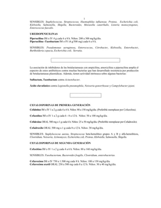 Este documento resume los antimicrobianos más comunes, incluyendo penicilinas, cefalosporinas, aminoglucósidos, macrólidos, lincosaminas, glucopéptidos, quinolonas y tetraciclinas. Describe las dosis habituales de cada fármaco y los microorganismos más frecuentemente susceptibles. También enfatiza la importancia del diagnóstico clínico y microbiológico para un uso racional de los antimicrobianos.