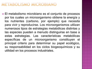 El documento describe los diferentes tipos de metabolismo microbiano, incluyendo la forma en que las bacterias obtienen carbono, equivalentes reductores y energía. También cubre el crecimiento bacteriano y los agentes antimicrobianos. Los tipos de metabolismo se clasifican según la fuente de carbono, equivalentes reductores y energía, y ejemplos incluyen quimiolitoautótrofos, fotolitoautótrofos y quimioorganoheterótrofos. El crecimiento bacteriano pasa por fases de adaptación, exponencial y estacionaria