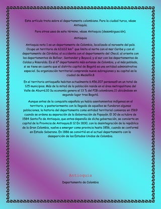El documento trata sobre el departamento colombiano de Antioquia. Antioquia está ubicado en el noroeste de Colombia, limita con varios departamentos y el mar Caribe, y su capital es Medellín. Tiene una población de más de 6 millones de personas y su economía genera el 13% del PIB de Colombia. La historia de Antioquia como departamento comienza en 1569.