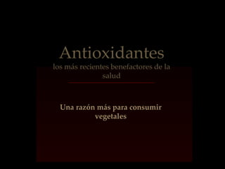 El documento habla sobre los antioxidantes y sus beneficios para la salud. Los antioxidantes se encuentran principalmente en alimentos vegetales y ayudan a bloquear los radicales libres que pueden dañar las células. Aunque los antioxidantes pueden reducir el riesgo de ciertas enfermedades, no previenen el envejecimiento ni aumentan la esperanza de vida. Lo más recomendable es consumir una dieta variada rica en vegetales en lugar de suplementos de antioxidantes.