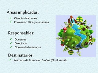 Este documento presenta un proyecto ambiental para alumnos de 5 años que busca generar conciencia sobre el cuidado del medio ambiente a través de actividades lúdicas y el uso de las TIC. El proyecto incluye visitas al patio de la escuela, la creación de murales y cuentos, y el uso de redes sociales para compartir las producciones de los alumnos y concientizar a la comunidad educativa. Los objetivos son enseñar a los niños sobre problemas ambientales, contribuir a su solución, y prepararlos para el uso