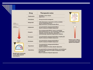 Este documento describe los antipsicóticos, medicamentos utilizados para tratar enfermedades psiquiátricas como la esquizofrenia. Explica que los antipsicóticos actúan bloqueando los receptores de dopamina en el cerebro para controlar síntomas positivos como alucinaciones y delirios, así como algunos síntomas negativos. También describe los efectos secundarios como movimientos extrapiramidales y aumento de peso. Resalta la eficacia de estos medicamentos para controlar brotes agudos de psicosis y