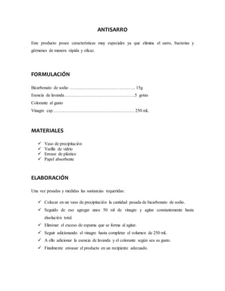 Este documento describe la elaboración de un antisarro a base de bicarbonato de sodio, vinagre, esencia de lavanda y colorante. Explica que el producto elimina rápidamente el sarro, bacterias y gérmenes de forma segura. Luego detalla los materiales, pasos y precauciones para su elaboración, así como instrucciones para su uso en limpiar sanitarios y superficies sin los efectos tóxicos de otros productos ácidos.