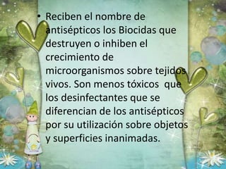 Los antisépticos son biocidas que destruyen o inhiben el crecimiento de microorganismos sobre tejidos vivos y son menos tóxicos que los desinfectantes. Los alcoholes y la clorhexidina son efectivos antisépticos comunes, donde los alcoholes funcionan mejor a concentraciones del 60-80% y la clorhexidina es bactericida, fungicida e inactiva virus. Otras opciones como el yodo, glutaraldehído y peróxido de hidrógeno también funcionan como antisépticos pero tienen