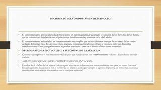 El documento trata sobre la relación entre la genética y el comportamiento antisocial. Explica que el comportamiento antisocial puede definirse como un patrón general de desprecio y violación de los derechos de los demás. Explora los aspectos neuroanatómicos, bioquímicos y neurogenéticos de la agresión, así como los factores ambientales y la interacción entre el genotipo y el ambiente en el desarrollo del comportamiento antisocial. Finalmente, discute cómo la genética cuantitativa y los estudios poblacional