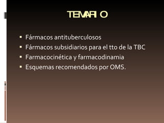 El documento resume los principales fármacos utilizados en el tratamiento de la tuberculosis, incluyendo isoniazida, rifampicina, etambutol y pirazinamida. Describe su mecanismo de acción, resistencia bacteriana, efectos adversos y esquemas de tratamiento recomendados por la OMS, como el esquema intensivo de seis meses.