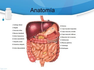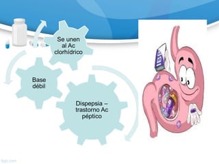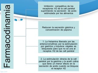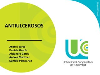 El documento discute el uso de antiulcerosos en el tratamiento de trastornos digestivos, destacando la clasificación, aplicaciones clínicas, y los efectos adversos de varios fármacos como antagonistas de los receptores H2 e inhibidores de la bomba de protones. Se menciona la importancia de la posología, interacciones farmacológicas y el manejo de ulceraciones relacionadas con estrés. Además, se abordan tratamientos específicos para erradicar Helicobacter pylori y prevenir complicaciones en pacientes de riesgo.