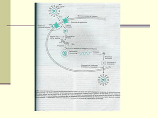 El documento habla sobre principios básicos de antivirales y algunos medicamentos usados para tratar infecciones por virus. Explica que los antivirales pueden actuar a nivel de entrada, salida o interior de la célula, e inhibir funciones específicas de los virus de manera selectiva. Luego describe medicamentos como aciclovir, valaciclovir y famciclovir usados contra herpes, así como ganciclovir, foscarnet y cidofovir contra citomegalovirus.