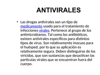 El documento aborda los antivirales, medicamentos específicos para tratar infecciones virales que son relativamente seguros para los huéspedes. Se describe el desarrollo de estos medicamentos, su funcionamiento, clasificación y principios de terapéutica, incluyendo la necesidad de un diagnóstico clínico correcto. Además, se menciona la existencia de diversos agentes antivirales y antirretrovirales destinados a tratar diferentes virus, como herpes, hepatitis e influenza.