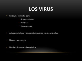 Este documento describe la estructura y replicación de los virus. Los virus están compuestos de ácido nucleico, proteínas y en algunos casos lipoproteínas. Se reproducen al penetrar células y utilizar la maquinaria celular para producir nuevos virus, los cuales luego se liberan para infectar más células. El ciclo de replicación viral incluye la fijación a receptores celulares, penetración de la célula, periodo de latencia donde se produce el ácido nucleico viral, maduración con síntesis de proteínas y liberación de nue