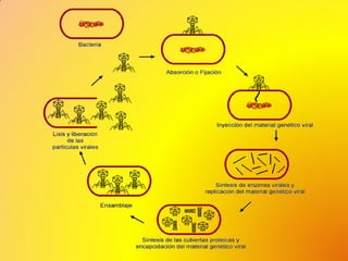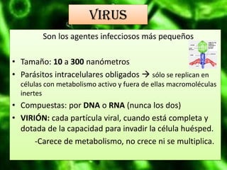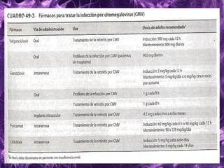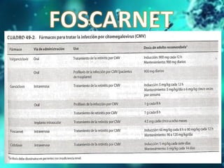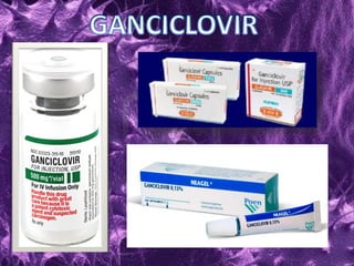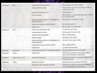 Los virus son agentes infecciosos obligados que sólo se replican dentro de células vivas, careciendo de metabolismo propio y compuestos necesarios para su replicación. Los antivirales son medicamentos que tratan infecciones virales, actuando en varias etapas de la replicación del virus y algunos de ellos requieren activación en el interior de la célula infectada. El aciclovir, un antiviral importante, se usa principalmente contra infecciones por herpes y actúa inhibiendo la polimerasa de DNA viral, mientras que otros antivirales, como la ribavirina y la amantadina, tienen mecanismos de acción diferentes.