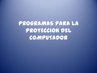 Este documento describe diferentes programas para proteger computadores, incluyendo antivirus y firewalls. Explica que un antivirus previene y elimina virus, y que hay varios antivirus gratuitos disponibles. Un firewall monitorea el tráfico de red entrante y saliente y bloquea o permite acceso de acuerdo a su configuración para proteger la computadora. También describe brevemente qué son virus informáticos y cómo se transmiten a través de correos electrónicos.
