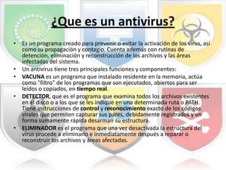 Este documento describe las funciones de un antivirus y un firewall. Un antivirus tiene tres componentes principales: un vacuna que actúa como filtro, un detector que examina archivos en busca de códigos virales, y un eliminador que remueve y repara archivos infectados. Un firewall comprueba la información entrante y permite o bloquea el paso basado en su configuración para prevenir acceso no autorizado a la red o envío de software malicioso. El documento también menciona algunos antivirus gratuitos como Microsoft Security Essentials, Avast y AV