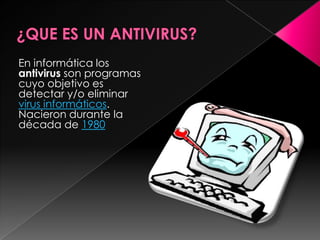 Este documento describe brevemente los antivirus, programas desarrollados en la década de 1980 para detectar y eliminar virus informáticos. Menciona que Antivirus es un programa antivirus lanzado en 1988 por la compañía checa ALWIL Software, que incluye la versión gratuita Avast! Home para Windows.