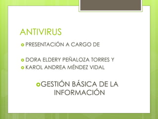 Este documento describe los antivirus, programas informáticos que detectan virus y otros programas maliciosos que pueden dañar la computadora. Explica que los antivirus son aplicaciones de software diseñadas para proteger los sistemas, y que es necesario mantenerlos actualizados para protegerse de nuevos virus. También brinda consejos sobre cómo usarlos correctamente y menciona algunos antivirus populares gratuitos y pagos.