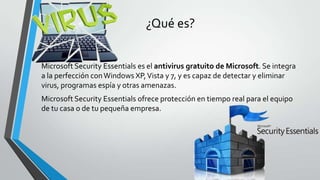 Microsoft Security Essentials es un antivirus gratuito de Microsoft que se integra perfectamente con Windows XP, Vista y 7 para detectar y eliminar virus, programas espía y otras amenazas en tiempo real. Ofrece protección básica como detección en tiempo real, actualizaciones automáticas gratuitas y cuarentena de archivos con un bajo consumo de recursos. Requiere Windows XP SP3 o posterior, al menos 256 MB de RAM y 200 MB de espacio en disco para su instalación y descargas de definiciones.