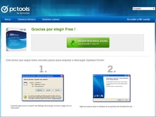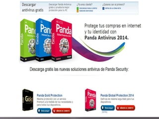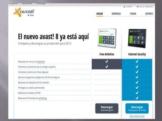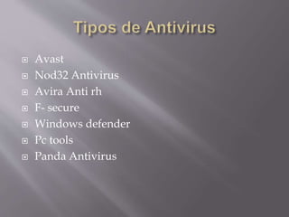 El documento proporciona información sobre diferentes antivirus, incluyendo Avast, Nod32, Avira, F-Secure, Windows Defender, PC Tools, Panda Antivirus y Registry Mechanic. Se describen las características, ventajas y desventajas de cada uno.