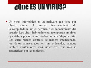 Un virus informático es un programa malicioso que altera el funcionamiento de una computadora sin el permiso del usuario e infecta otros archivos. Existen varios tipos de virus como gusanos, caballos de Troya y virus de macros. Los antivirus son programas que detectan y eliminan virus, y han evolucionado para bloquear, desinfectar y prevenir infecciones de virus y otros malware. Algunos de los antivirus más populares son Kaspersky, Panda Security, Norton y McAfee.