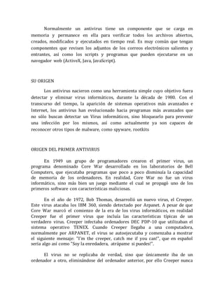 Los antivirus son programas que detectan y eliminan virus informáticos y otros malware. Nacieron en la década de 1980 y han evolucionado para bloquear infecciones, desinfectar archivos y reconocer spyware, gusanos y rootkits. El primer antivirus fue el programa Reaper creado en 1973 para eliminar al virus de red Creeper.