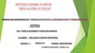 Este documento describe los antivirus, sus métodos de evolución para detectar diferentes tipos de malware además de virus, y sus métodos de protección como la detección, desinfección y prevención de infecciones. También explica los principales métodos de contagio de virus como programas ejecutados inadvertidamente por el usuario o gusanos replicándose a través de redes, y los tipos de vacunas como las de detección simple, detección y desinfección, o detección y aborto de acciones dañinas.