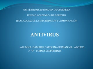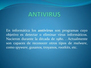 Este documento describe los antivirus, programas que detectan y eliminan virus informáticos. Explica que existen dos tipos de propagación de virus e identifica varios métodos que los antivirus usan para contenerlos, como detección, desinfección, aborto de acciones maliciosas y comparación de firmas. También menciona dos antivirus específicos, Webroot y ESET Smart Security, resaltando algunas de sus características.