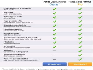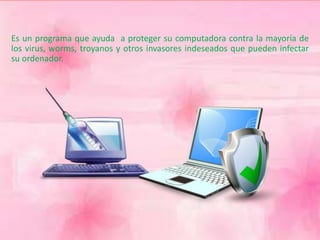 El documento habla sobre antivirus y cómo protegen las computadoras de virus, gusanos y otros programas maliciosos. Explica que los antivirus detectan y eliminan estas amenazas, evolucionando para hacer frente a sistemas operativos y redes más avanzadas. También describe los principales modos en que estos programas dañinos se propagan e infectan sistemas, así como las características clave que debe tener un buen antivirus. Finalmente, resume las funciones de algunos de los antivirus más populares como Kaspersky, Avira, Panda,