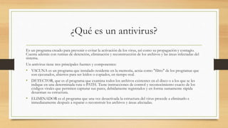 Un antivirus es un programa diseñado para prevenir la activación de virus y su propagación, con componentes como vacuna, detector y eliminador. Existen diferentes tipos de antivirus: preventores que evitan infecciones, identificadores que detectan programas dañinos, y descontaminadores que eliminan malware en sistemas infectados. También se incluyen cortafuegos que bloquean el tráfico no deseado y programas antiespías o antipop-ups que protegen contra amenazas adicionales.