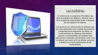 Un antivirus es un programa que detecta y elimina virus u otros programas dañinos antes o después de que ingresen a un sistema. Los antivirus se han diseñado como medidas de protección para resguardar datos y el funcionamiento de sistemas de virus o malware que pueden alterar o destruir computadoras. Existen diferentes tipos de antivirus como preventores, descontaminadores e identificadores.