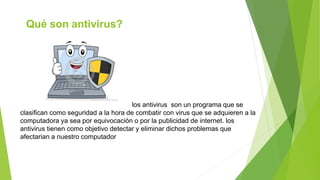 Los antivirus son programas que detectan y eliminan virus en las computadoras. Existen diferentes tipos de antivirus como los preventivos que se anticipan a las infecciones, los identificadores que detectan programas maliciosos y los descontaminadores que eliminan los sistemas afectados. Algunos de los antivirus más populares son Kaspersky, Avast, AVG, Avira y Eset.