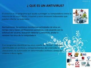 El documento describe qué es un antivirus, cómo funciona y varios ejemplos de antivirus populares como Panda Security, McAfee Antivirus Plus, Norton Antivirus, ESET NOD32, Kaspersky, AVG anti-virus, Avast!, Zone Alarm Antivirus y Avira. Un antivirus es un programa que protege las computadoras contra virus, troyanos y otros malware mediante la detección y eliminación de estos. Funciona monitoreando actividades en tiempo real y realizando escaneos periódicos para identificar malware basado en firmas y comportamientos sos